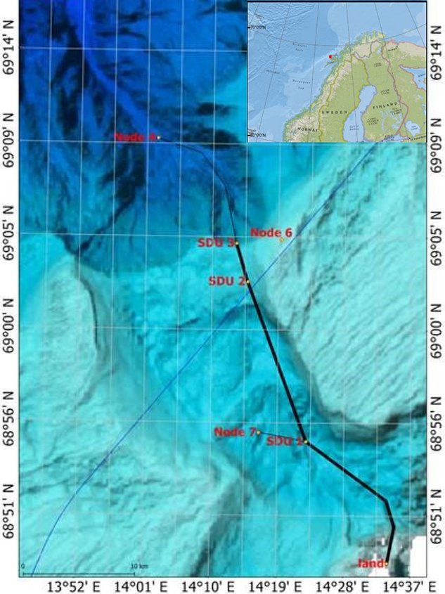 Den første delen av kabelene fra land til første observasjonsplatform er alt på plass. Nå skal resten av kabelen over legges. Kart: HI