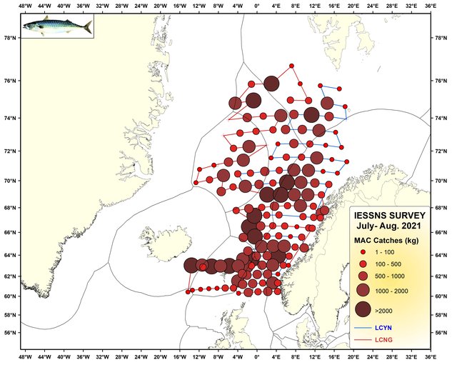Det ble fanget betydelig lavere makrellfangster under årets makrell-økosystemtokt med «Eros» og «Vendla» sammenlignet med fjorårets tokt. Totalt utførte de to norske fartøyene 145 standardiserte 30-min trålhal med om lag 5 knop tauefart i de øverste vannmassene (0 til 35 meter) etter makrell.