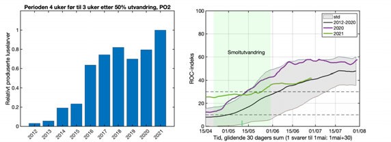 For å se på hvor det er høyest tetthet av lakselus under tiden for utvandringavpostsmoltlaks, har vi summert tetthet av kopepoditter fra antatt tidspunkt for 50% utvandring og 30 dager frem i tid. Dette konsentrasjonsfeltet har så blitt regnet om til kategorier ved hjelp av ROC metoden.