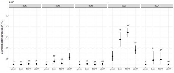 For å se på hvor stor andel av arealet i produksjonsområdet som blir uegnet for beitende sjøørret har vi benyttet samme metode som over, men tilpasset ørret som beskrevet i Finstad mfl. (2021). Selv om sjøørret dør av høye infeksjoner med lakselus, kan sjøørret smittet med lakselus oppsøke området med brakk- eller ferskvann for avlusing. Effekten av dette er at sjøørret avbryter beiteperioden, som vil medføre tapt vekst, som igjen kan påvirke alder ved kjønnsmodning og investering i kjønnsmodning. Dødelighet er derfor et dårlig mål på effekten av lakselus på sjøørret, og det har derfor blitt foreslått å bruke redusert marint leveområde, RML (dvs. hvor stor andel av leveområdet som blir uegnet pga. høye tettheter av lakselus) og redusert marin beiteperiode, RMT (dvs. 70 (eller 60) dager fratrukket antall dager før RML = 30% ved antatt dato for utvandring).