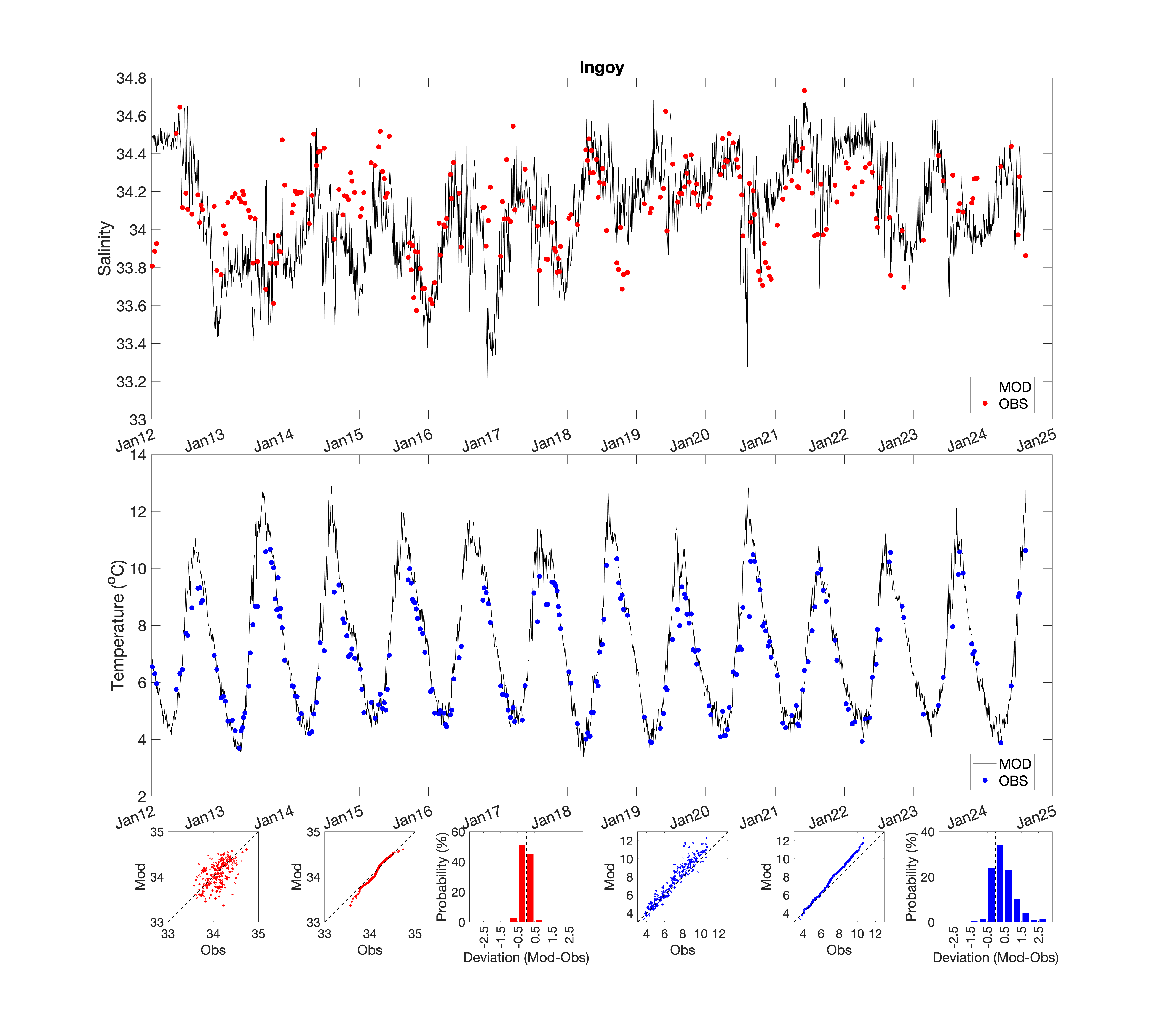 Figur C1. Sammenligning av målte og modellerte saltholdigheter (rød grafikk) og temperaturer (blå grafikk) utenfor Lista fra 10m dyp. Øverste og midterste panel viser tidsserie av hhv. saltholdighet og temperatur fra 2012-24 der røde og blå sirkler er måledata, mens de sorte linjene angir modellerte verdier. Panelene nederst viser spredningsdiagram (målt verdi mot modellert verdi til samme tid), qq-plott (målt verdi mot modellert verdi etter at alle verdier er rangert fra minst til størst) og histogram av modellens avvik i forhold til målingene for både saltholdighet (røde) og temperatur (blå).Figur C2. Samme som C1, men her fra Sognesjøen.Figur C3. Samme som C1, men her fra utenfor Bud.Figur C4. Samme som C1, men her fra utenfor Eggum.Figur C5. Samme som C1, men her fra utenfor Ingøy.