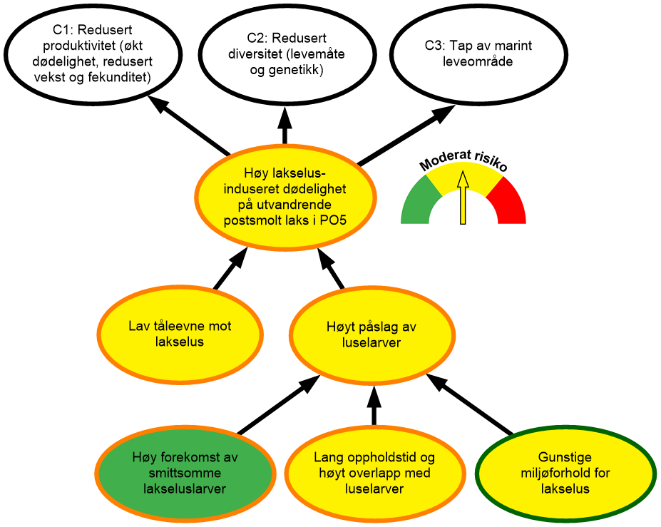 Figur 15.3. Visualisering av risiko for «Høy lakselusindusert dødelighet på utvandrende postsmolt laks» i produksjonsområde 13 (PO13), Øst-Finnmark. Fargen i nodene gjengir vurdering av sannsynlighet som enten er lav (grønn fargekode), moderat (gul fargekode) eller høy (rød fargekode). Vurdering av kunnskapsstyrken som ligger til grunn for sannsynlighetsvurderingen er visualisert med en ring rundt noden med kategoriene sterk (grønn fargekode), moderat (oransje fargekode) eller svak (rød fargekode) kunnskapsstyrke. Vurderingen av risiko er symbolisert med et manometer, der grønn, gul og rød farge representerer henholdsvis lav, moderat og høy risiko. Konklusjon om risiko bygger på tre forhold: alvorlighetsgrad av konsekvenser (C1–C3), sannsynlighet for hendelse og kunnskapsstyrken den baseres på.