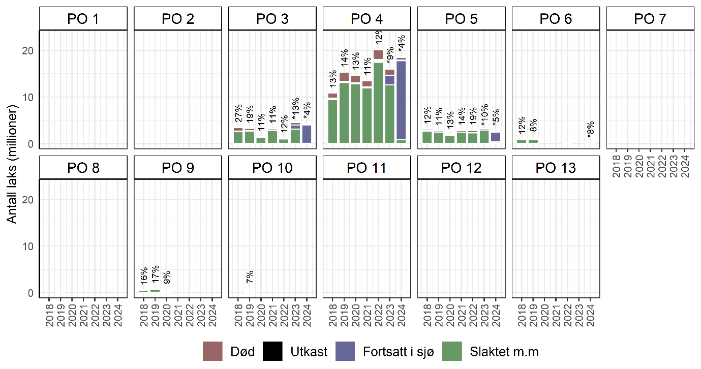 Risiko for «Dårlig velferd hos oppdrettslaks i sjø» vurderes som høy i PO1-6 og i PO12. For PO6 er det dermed en forverring fra fjorårets vurdering. Dette skyldes hovedsakelig en trend mot forhøyet produksjonsdødelighet de siste årene og et komplekst risikobilde med mye usikkerhet grunnet sårbarhet mot enkelthendelser. Risikoen vurderes som moderat i PO7, PO10, PO11 og PO13 som er den samme som tidligere år. Det er kun i PO8 og PO9 det vurderes å være lav risiko for dårlig velferd hos oppdrettslaksen. Innrapporterte tall til Fiskeridirektoratet sin biomassestatistikk for norske oppdrettsmerder per 20.1.2025 viser at totalt 60 millioner oppdrettslaks ble rapportert som døde (57 millioner) eller var i så dårlig stand at de ble registrert som utkast (3 millioner) i 2024. Dette er en nedgang fra 65 millioner i 2023. Mye av denne nedgangen i dødelighet sammenfaller med at innsiget av perlesnormanet totalt sett ble mindre alvorlig i 2024 enn i 2023.