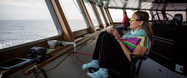 Although the “toolbox” of whale researchers now includes satellite tagging, more traditional observation methods are still useful. Here whale observer Yasmin Hunt is on the lookout for the ocean giants during the ecosystem survey of the Barents Sea in 2018. (Photo: Erlend Astad Lorentzen / Institute of Marine Research)