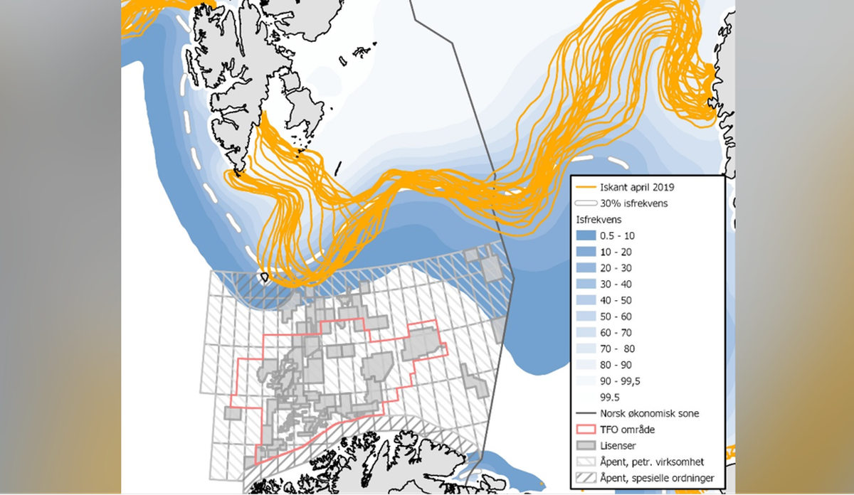The orange lines show the position of the ice edge (sea ice concentration of 15%) on all of the days in April 2019 (source: NSIDC). The blue and white lines show the sea ice frequency (1988-2017) for April (source: Norwegian Polar Institute), while the grey and red lines and areas show oil and gas fields and licences (source: NorwegianPetroleum.no).