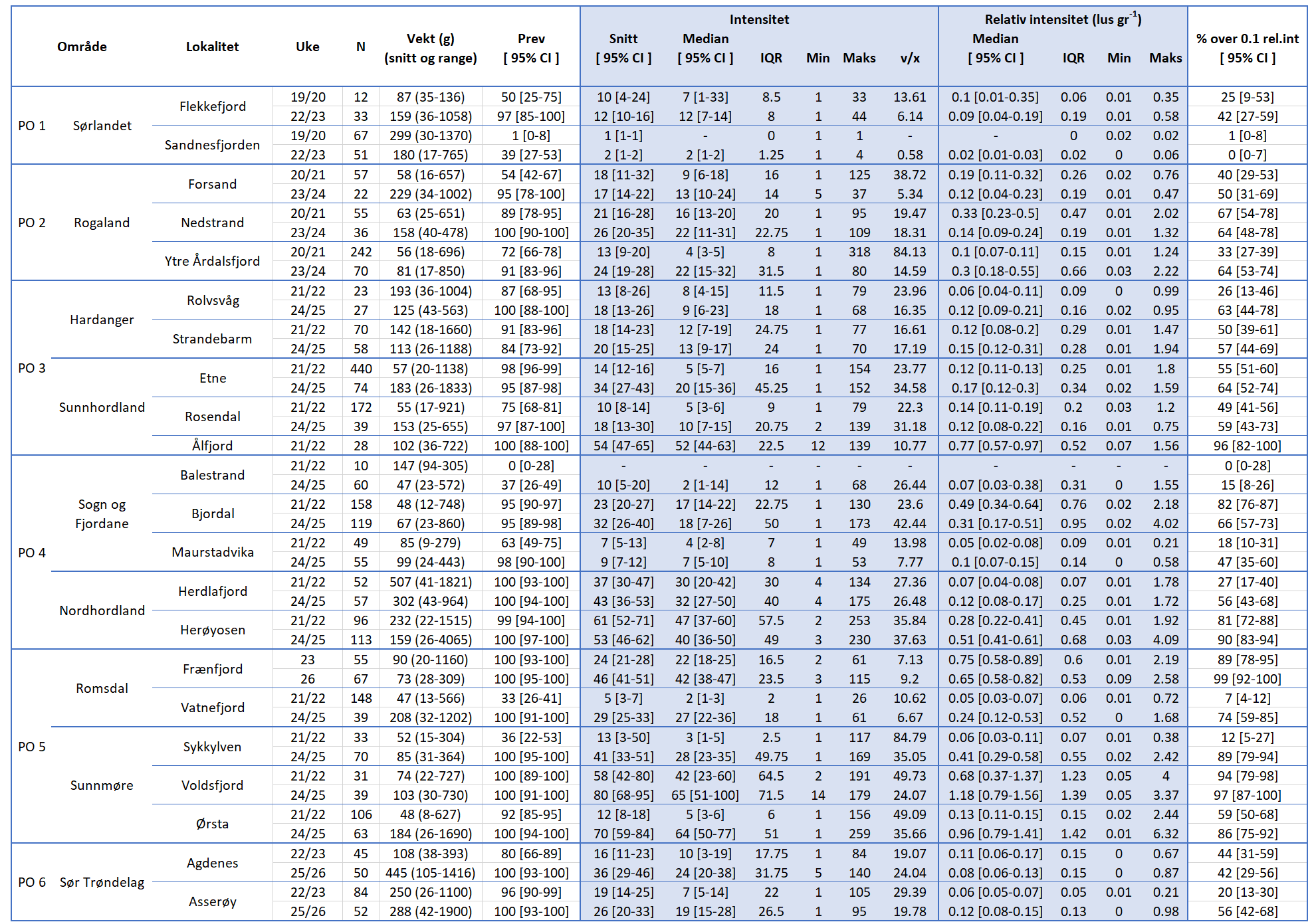 Relativ intensitet er antall lakselus per gram kroppsvekt hos fisken og er oppgitt som Median med beregnet 95 % konfidensintervall i klammer. IQR, Min og Maks er også oppgitt for relativ intensitet. Helt til høyre er andelen med mer enn 0,1 lus per gram kroppsvekt (% over 0,1 rel. int.) oppgitt for hele det undersøkte materialet (inkludert fisk uten lakselus), med beregnet 95 % konfidensintervall i klammer.