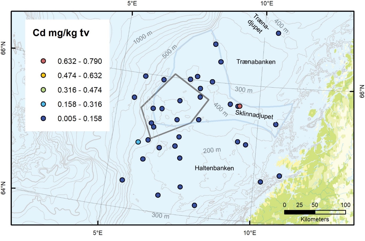 Prøvelokalitetene har vanndyp varierende fra 261 m til 826 m og er primært lokalisert til forsenkninger hvor det kan foregå sedimentasjon av finkornete sedimenter. Det stengte fiskefeltet er i hovedsak lokalisert innenfor Nordland II-området med olje- og gassproduksjon fra etablerte felter, nordvest for Haltenbanken. Det er i tillegg fiskeriaktivitet og skipstrafikk i området. Både havstrømmer med atlantisk vann og kystvann passerer området på sin vei nordover, og begge havstrømmene kan transportere miljøgifter fra andre geografiske områder til dette området.