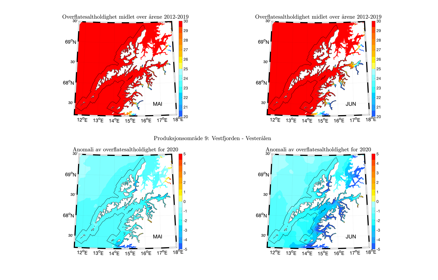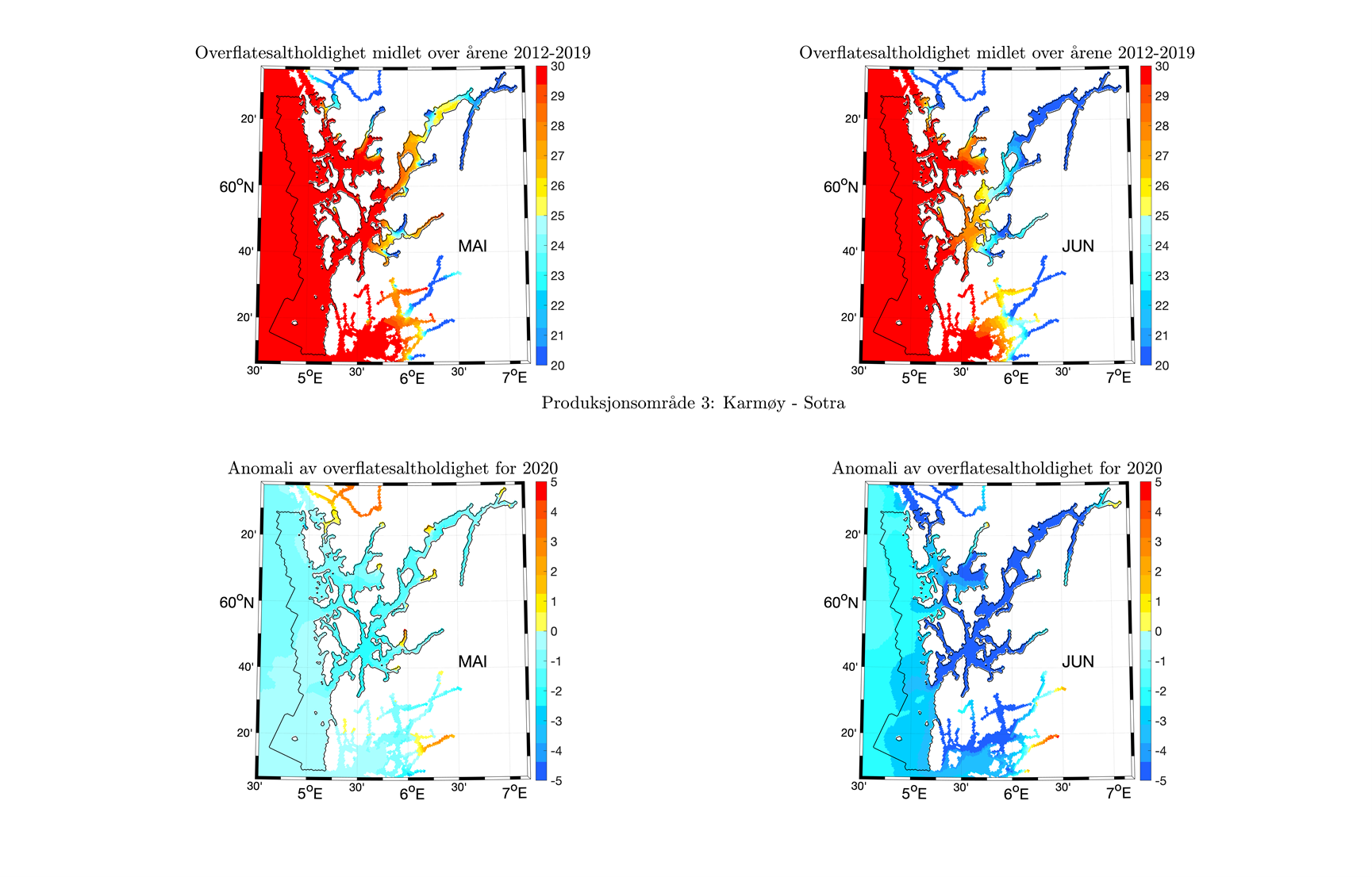 I tillegg til å presentere brakkvannsstyrken som romlig aggregerte tidsserier, presenteres det også romlige kart av overflatesaltholdighet for hvert produksjonsområde. I tillegg til månedsklimatologi (2012-19) for mai og juni vises siste års avvik fra disse.