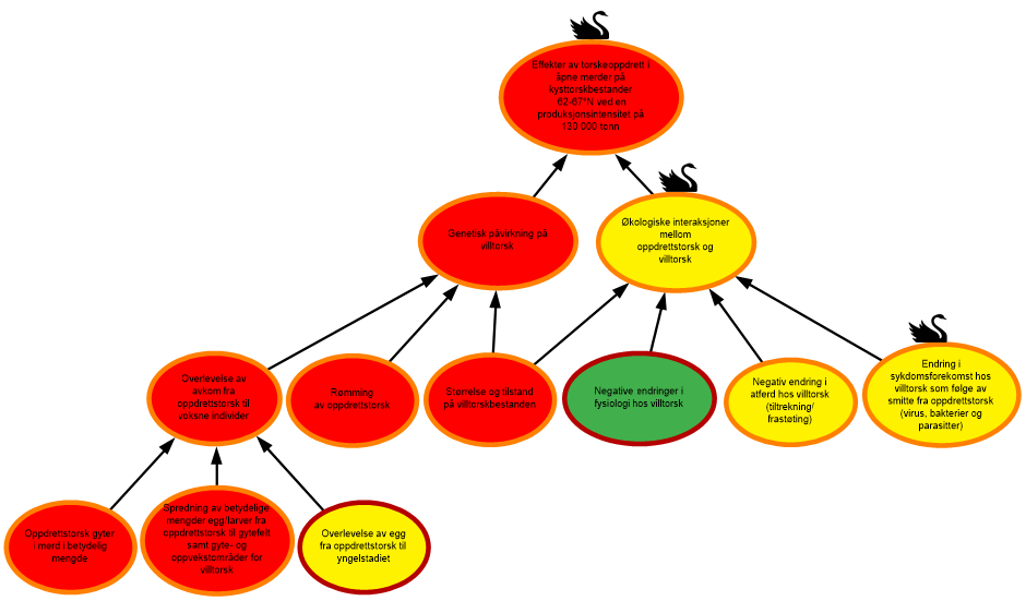 Effekten av å evaluere bakgrunnskunnskapen blir spesielt tydelig i forbindelse med analyser av potensialet for overraskelser, såkalte «sorte svaner». Begrepet ble første gang presentert i en risikostyringssammenheng av Taleb (2007) og videreutviklet i bl.a. Aven (2014) som beskriver slike hendelser som ekstremt alvorlige, og som dukker opp som totale overraskelser sett i forhold til vår kunnskap og hva vi tror vil kunne skje. Fagmiljøene ved både Havforskningsinstituttet og andre som er involvert i denne risikovurderingen, beskriver potensialet for slike overraskelser der det eksempelvis finnes kombinasjoner av utilstrekkelig kunnskap, hypoteser og svakt funderte antakelser som kan bidra til å skjule risiko. Der risikokilder eller hendelser vurderes å kunne gi opphav til slike overraskelser er disse markert med et «sort svane» merke i risikokartene.