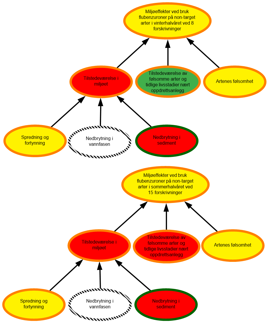 For fôrmidler som spres via organiske partikler til bunnsedimentet, vil effekten i hovedsak være knyttet til langtidspåvirkning av bunnlevende organismer. Generelt vil det være redusert risiko ved å bruke fôrbaserte midler i vinterhalvåret på grunn av redusert biologisk aktivitet som skallskifte og spiseaktivitet hos non-target-arter sammenlignet med i sommerhalvåret. Forbruket av flubenzuroner ble ytterligere redusert i 2021 sammenlignet med 2020, og det reduserte forbruket gjør at risikoen for effekter på non-target-arter er moderat både i sommer- og vinterhalvåret. På grunn av den lange halveringstiden vil flubenzuroner kunne være til stede i miljøet gjennom hele året. Emamektin har i de siste årene utgjort en stor andel av forskrivningene, 64 prosent i 2021. Følsomhet for emamektin er foreløpig studert på få arter, og data indikerer lav følsomhet. Siden forbruket er høyt, er det viktig med mer kunnskap, også relatert til norske arter.