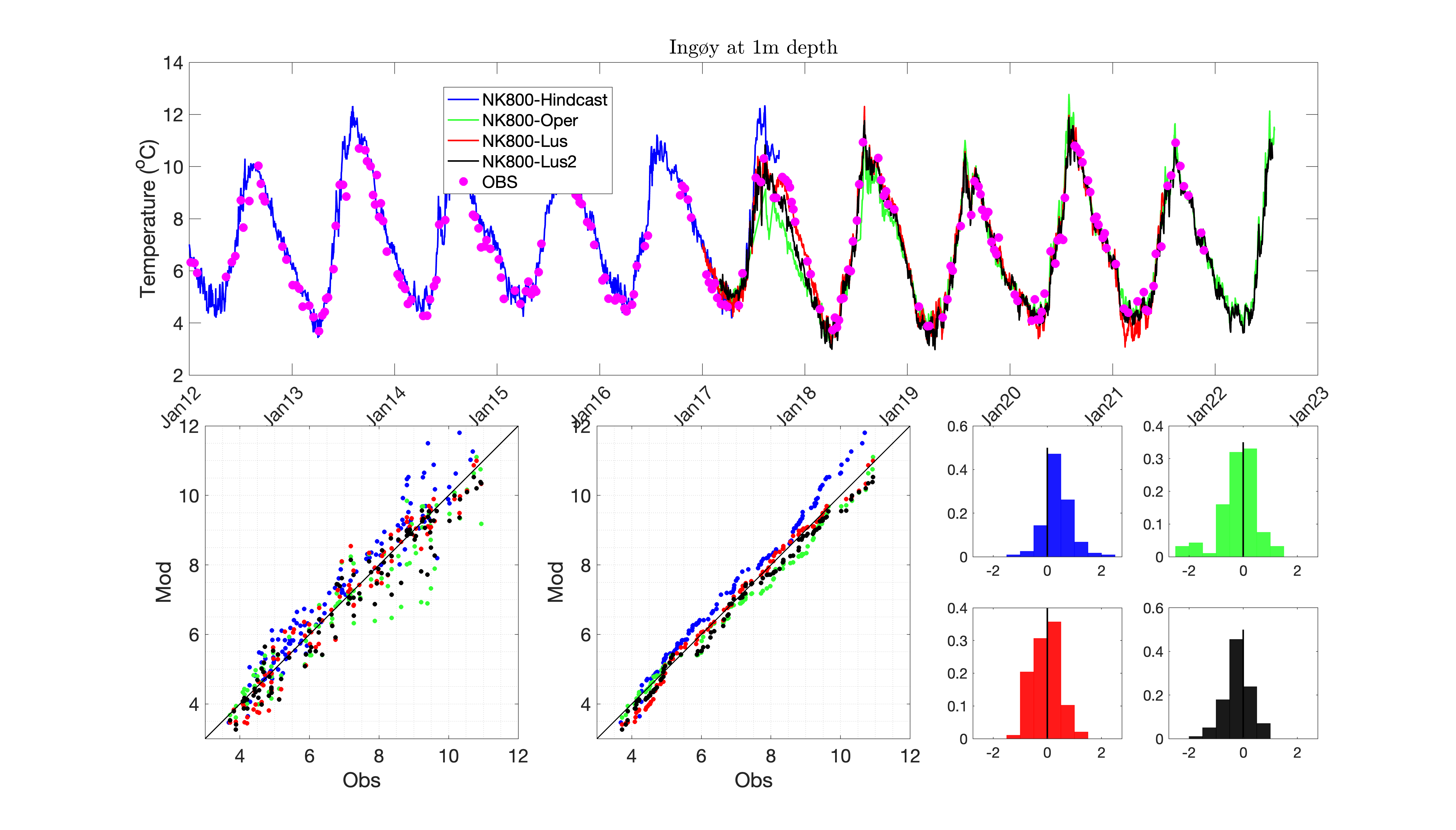 Hvis man antar at måledataene er korrekte, kan man gå i detalj i forhold til analyse av modellfeil ved å beregne standardavviket til modellavvikene. Et mål på dette er «Root Mean Square Error (RMSE)» som går ut på å ta kvadratroten av middelverdien til modellavvikene kvadrert. Det beste estimatet modellene kan ha på saltholdighet for enkeltpunktene er lik den observerte verdien, og RMSE gir da et mål på hvor spredt modellverdiene er fra denne "fasit". Ved å sammenlikne standardavviket til tidsserien med RMSE ser vi at for Sognesjøen er RMSE lavere for alle modellene. Selv NorKyst800 Operasjonell har litt lavere RMSE enn standardavvik til tross for at modellen underestimerer den faktiske variabiliteten. For målepunktet utenfor Ingøy er den naturlige variabiliteten i saltholdighet på 1 m dyp mye lavere enn i Sognesjøen. Alle modellen unntatt Lus gjenskaper denne variabiliteten veldig godt. Mens Hindcast har generelt litt for høye saltholdigheter i Kyststrømmen utenfor Finnmark, her representert med Ingøy, viser statistikken at Operasjonell og Lus2 kun har små avvik fra måledataene. Rent modellteknisk vil et slikt punkt i modellen være svært avhengig av kvaliteten på storhavsmodellen som gir data til de åpne grenseflatene til NorKyst800, og systematiske avvik i disse modellen vil forplante seg inn mot kysten.