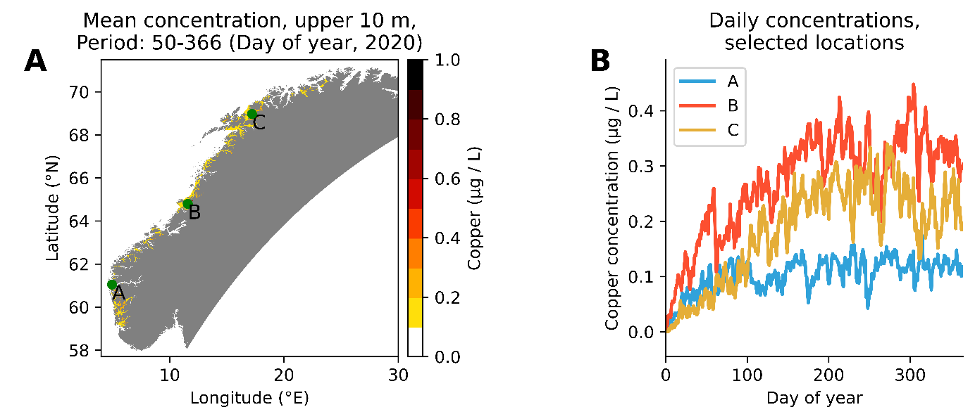 Model simulations where we assume that 28 % of copper has leaked to the water column, show that passive leaked copper can give a substantial contribution to the total copper concentration in a fjord system, of approx. 0.2-0.4 µg/l. In narrow fjords with less water exchange the contribution may be as high as 1 µg/l. Rinsing or high pressure rinsing of copper impregnated net pens may give higher pulses with higher concentrations. Environmental quality standards for copper in coastal water is 2,6 µg/l. We have measured concentration in fjords in Vestland from < 0.5 to 1.9 µg/l in 2021.
