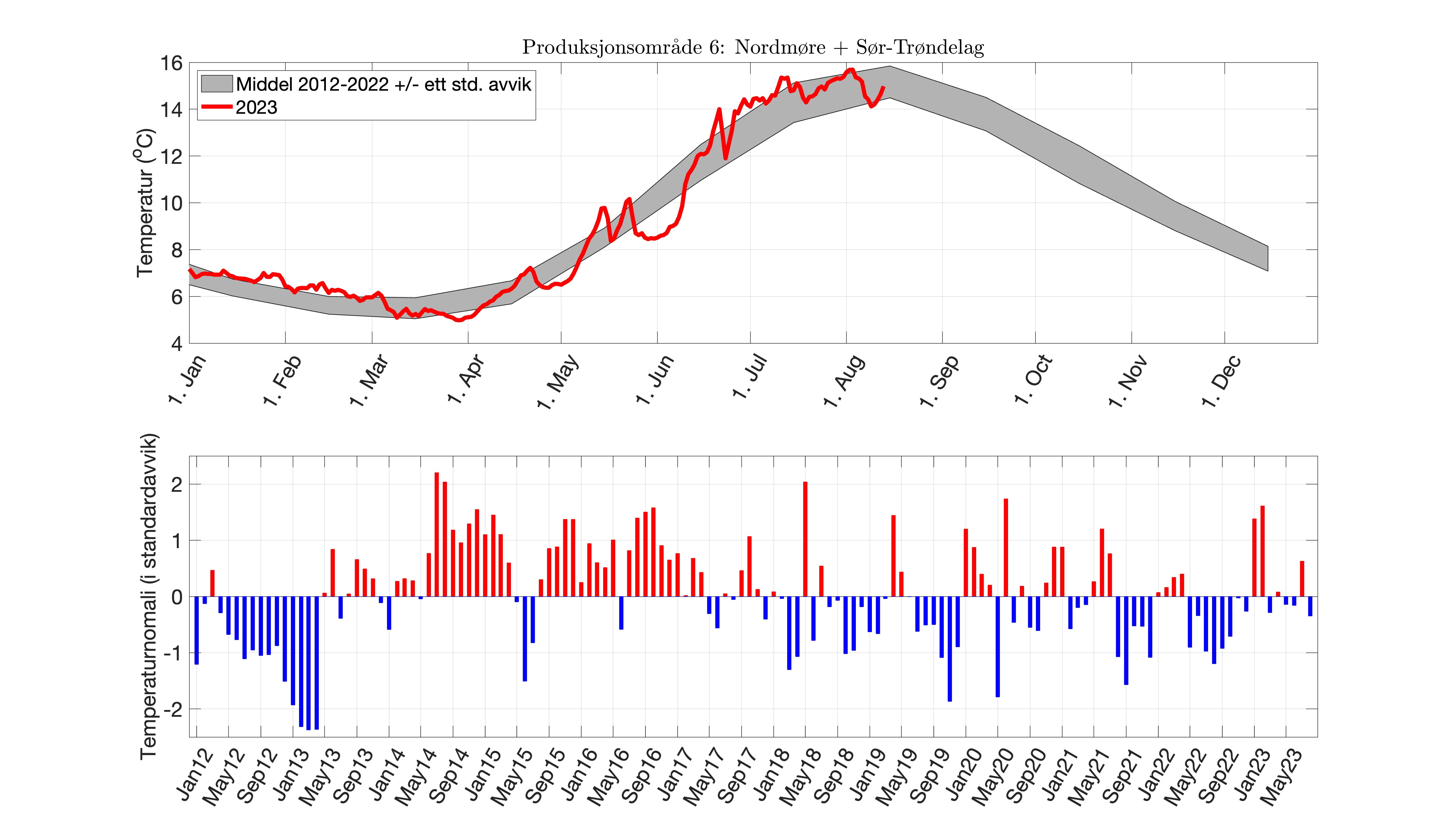 Vintermånedene januar og februar 2023 har vært noe varmere enn normalt i så å si hele landet. De påfølgende vårmånedene har hatt nær normale temperaturer. En kraftig oppvarming av overflatevannet i juni førte til at områdene sør for Trøndelag hadde relativt høye temperaturer på forsommeren. Mens sommertemperaturene var normale sør for Trøndelag resten av sommeren, var det relativt høye temperaturer i den nordlige delen av landet i juli og august etter svært godt vær i vår nordligste landsdel.