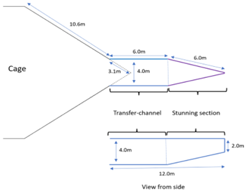 Norwegian transfer of BFT between net and cages will likely employ netting channels similar to those used in other pelagic fisheries for mackerel and herring. However, the size and specific characteristics of BFT means that the design of such channels needs to be optimized. Because BFT are suspectable to skin abrasion and subsequent infection, the transfer method used needs to avoid fish-gear contact. The design of the channel should also facilitate rapid transfer, so that the process is completed as soon as possible.