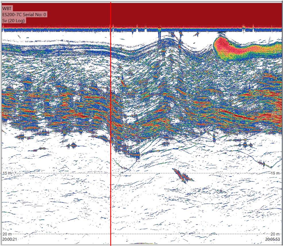 Figure A2.4 EK80 recordings from the Kayak Drone as RV Kristine Bonnevie passes close by during passing 5. A layer of sprat is detected from 3 – 15 m below the surface. The nearest point of approach is marked as a red line in the echogram.