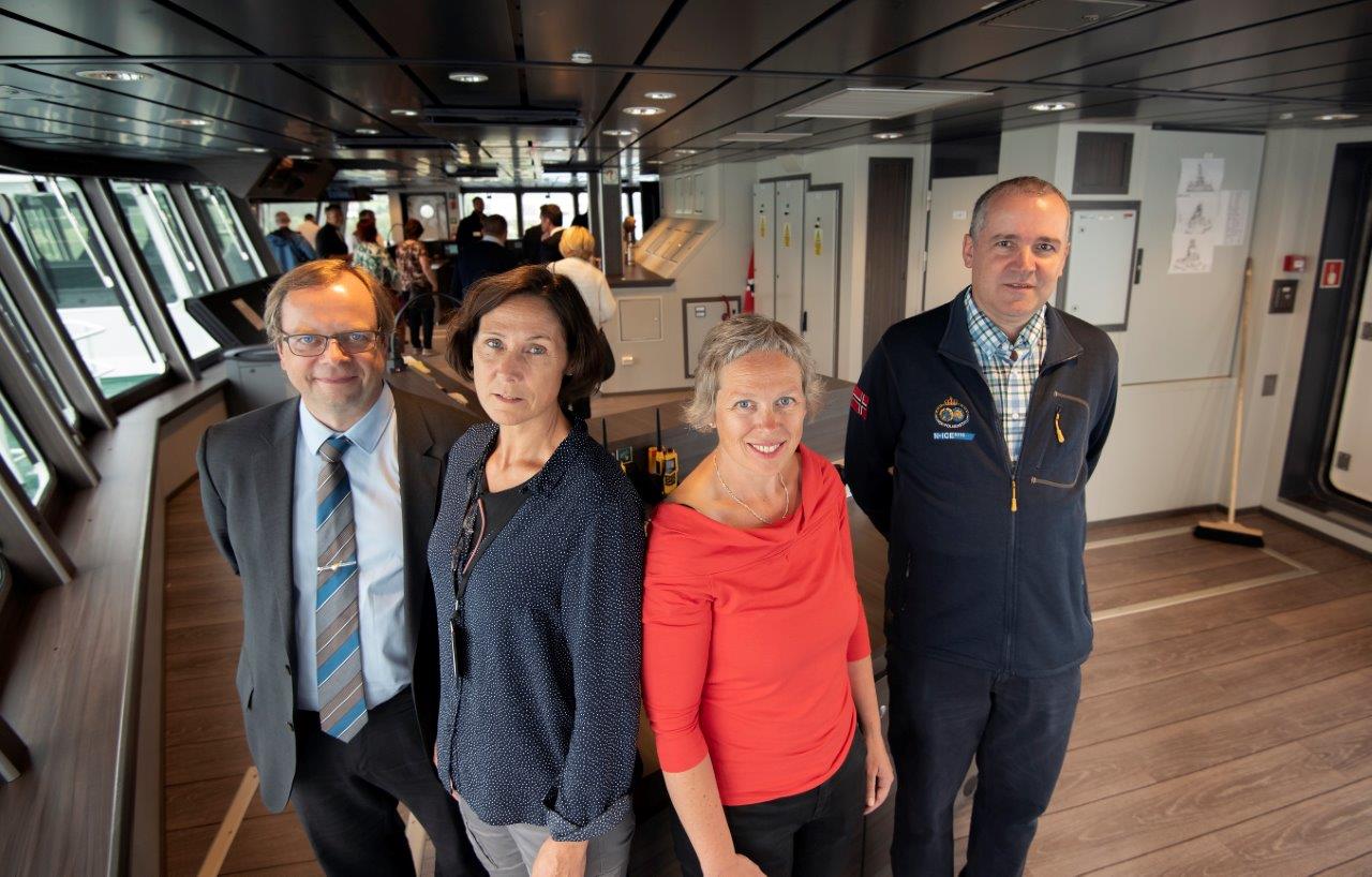 Arven etter Nansen (AeN) er et samarbeidsprosjekte mellom ti norske forskningsinstitusjoner. Tre av dem var representert da det første toktet med "Kronprins Haakon" ble markert i dag. Fra.v.: Kenneth Ruud (UiT), styreleder i AeN, Randi Ingvaldsen (HI), toktleder, Marit Reigstad (UiT), prosjektleder og Sebastian Gerland (NP), nestleder i AeN-styret. (Foto: Gunnar Sætra / Havforskningsinstituttet)