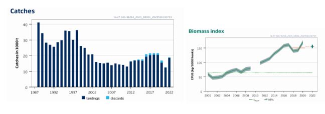 ICES anbefaler at når MSY-tilnærmingen brukes, bør fangstene ikke være mer enn 13 317 tonn i hvert av årene 2024 og 2025. Hvis utkastraten ikke endrer seg fra gjennomsnittet for de tre siste årene (2020–2022), innebærer landinger på ikke mer enn 12 785 tonn.