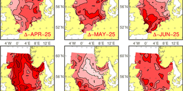 De marine varmebølgene som ble observert sensommeren 2024 og 2025 er også observert med profilerende bøyer (Argo bøyer) i nordlige Norskehavet, og i 2025 var sommertemperaturen der over 2°C høyere enn langtidsmidellet. Selv om denne ekstremvarmen rakk ned til bare ca. 30 m var sommeren i 2025 varmere enn normalt ned 200 m dyp. I dypet under (500-800 m) har temperaturen derimot vært lik eller lavere enn langtidsmiddelet siden 2019. Dypere nede har det pågått en oppvarming de siste 30 årene, og temperaturen i det intermediære laget (~1000 m) og dyphavet (~2000 m) har i denne perioden steget med henholdsvis 0,3°C og 0,15°C. Dette skyldes innblanding av varmere intermediært/dypvann fra Grønlandshavet. For mer informasjon, se Mork mfl. 2025 (Journal of Geophysical Research - Oceans).