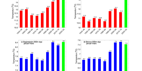 Havforskningsinstituttets måleserier viser at sjøtemperaturene i de øverste 200 m av havet har økt de siste 40 årene, men også at det er tydelige naturlige variasjoner som gir lavere temperaturer i perioder. Alle havområdene hadde en ganske kald periode på 1990-tallet og en tydelig oppvarming tidlig på 2000-tallet. For nordlige Nordsjøen, det sørvestlige Barentshavet og kystområdene ble dette etterfulgt av noen kaldere år rundt 2010, før en ny varm periode slo til. Etter 2018 har imidlertid sjøtemperaturene i det sørvestlige Barentshavet og det sørlige Norskehavet minket. Sjøtemperaturene i Nordsjøen og ved kysten har derimot holdt seg høye eller økt enda mer. Kysten langs Sør- og Vestlandet var rekordvarm i 2025, og på høsten ble det observert høyere sjøtemperaturer enn noen gang tidligere langt ned i havet ved kysten. Kysten utenfor Lofoten-Tromsø var også varm i 2025, men ikke like varm som i sør. Både i 2024 og 2025 har det vært kraftige marine varmebølger på sensommeren i disse nordlige områdene.